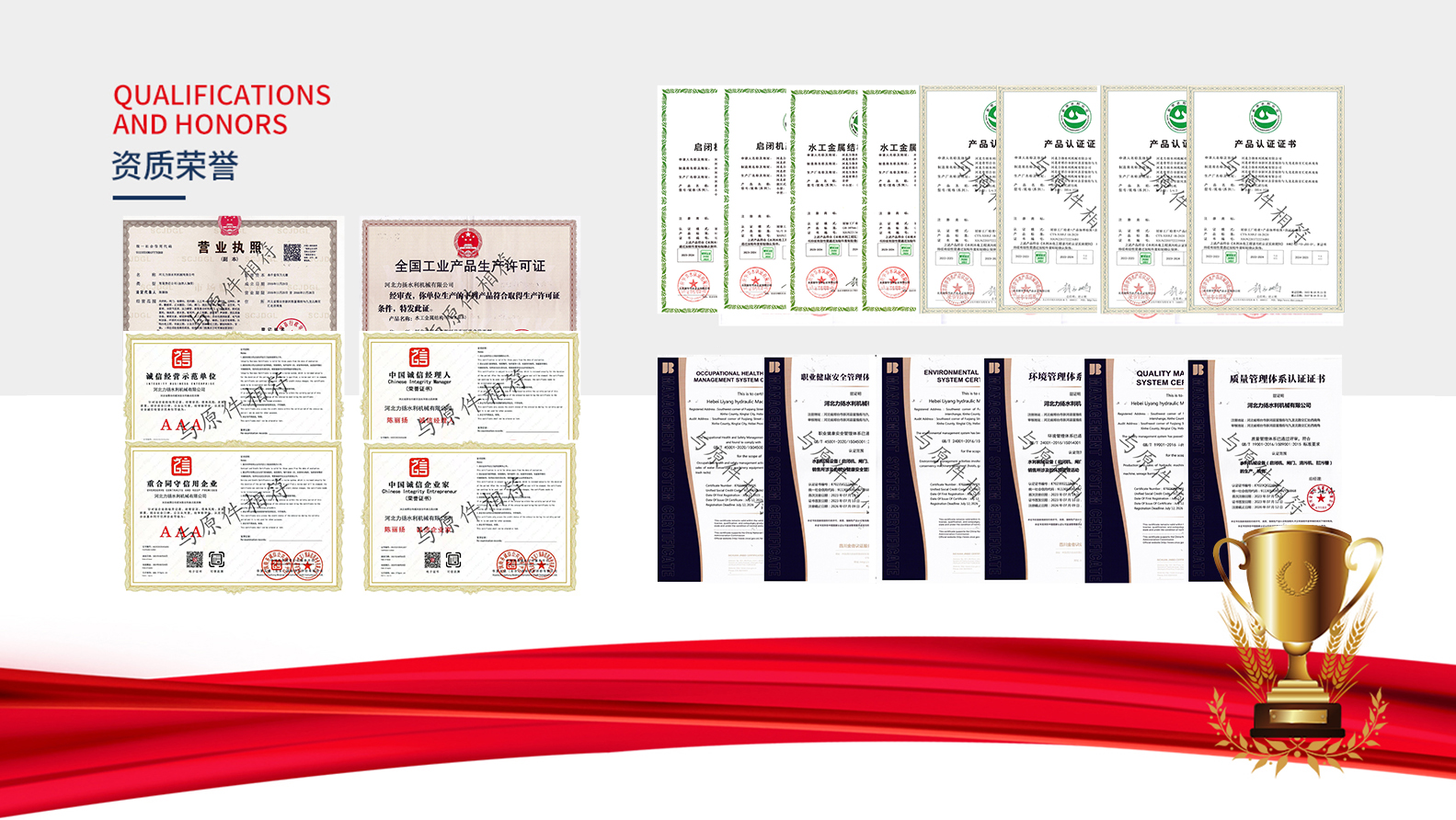 關(guān)于我們 購(gòu)   河北力揚(yáng)水利機(jī)械有限公司,成立于2016年,地址河北省邢臺(tái)市新河縣富強(qiáng)街與九龍北路交匯處西南角具備生產(chǎn)及供應(yīng)、安裝能力。我們公司位于董振堂將軍故里,河北省邢臺(tái)市新河縣九龍工業(yè)區(qū),是一家集設(shè)計(jì)、生產(chǎn)、銷售、安裝、售后一體的綜合性水利機(jī)械廠家,現(xiàn)有人員共40余名,獲有國(guó)家頒發(fā)的全國(guó)工業(yè)產(chǎn)品生產(chǎn)許可證、ISO質(zhì)量管理體系認(rèn)證、環(huán)境體系認(rèn)證、職業(yè)健康體系認(rèn)證并且我公司通過(guò)水利相關(guān)部門水工金屬結(jié)構(gòu)質(zhì)量檢驗(yàn)中心的考核和監(jiān)督下獲得了:認(rèn)證頒發(fā)的四項(xiàng)產(chǎn)品認(rèn)證證書(平面閘門、弧形閘門、回轉(zhuǎn)式清污機(jī)、耙斗式清污 ABOUT US